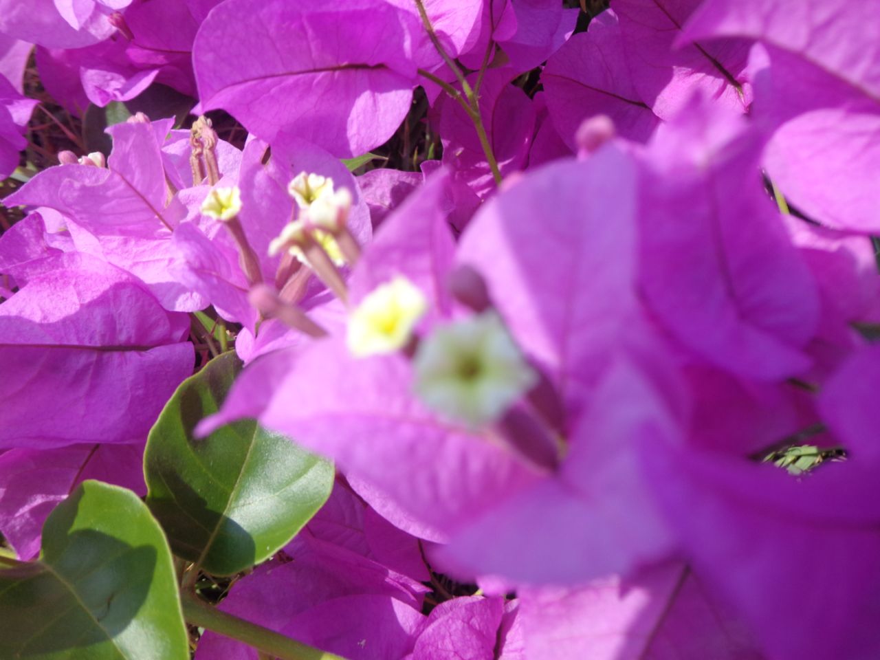 เฟื่องฟ้า เป็นไม้พุ่มกึ่งเลื้อยอายุยืน สูง 1.8 เมตร เรือนยอดทรงพุ่มกลม ทึบ มีหนามขึ้นตามลำต้นอยู่เหนือใบ เปลือกลำต้นสีเทานวล แตกเป็นเส้น ไม่มียาง ใบเป็นใบเดี่ยวแตกออกสลับกับกิ่งหรือเยื้องกัน มีขนขึ้นปกคลุมเล็กน้อย มีสีเขียวหรือใบด่าง รูปร่างรีแหลมยาว 3-6 เซนติเมตร กว้าง 2.5 เซนติเมตร ใบประดับลักษณะคล้ายรูปหัวใจหรือรูปไข่มี 3-5 ใบ มีหลายสี เช่น ม่วง แดง ชมพู ส้ม ฟ้า เหลืองและอื่นๆ ผู้พบเห็นทั่วไปมักเข้าใจว่าใบประดับคือดอก ดอกมีทั้งดอกสมบูรณ์เพศและไม่สมบูรณ์เพศ ออกเป็นช่อตามซอกใบหรือปลายกิ่ง แต่ละช่อมี 3 ดอก เป็นหลอดยาว 1-2 เซนติเมตร ติดอยู่ที่เส้นกลางใบของใบประดับ ส่วนใหญ่มักเข้าใจว่าดอกคือเกสรดอก ดอกเป็นชนิดไม่มีกลีบดอก มีกลีบเลี้ยง 5 กลีบ มีเกสรตัวผู้ 5-10 อัน